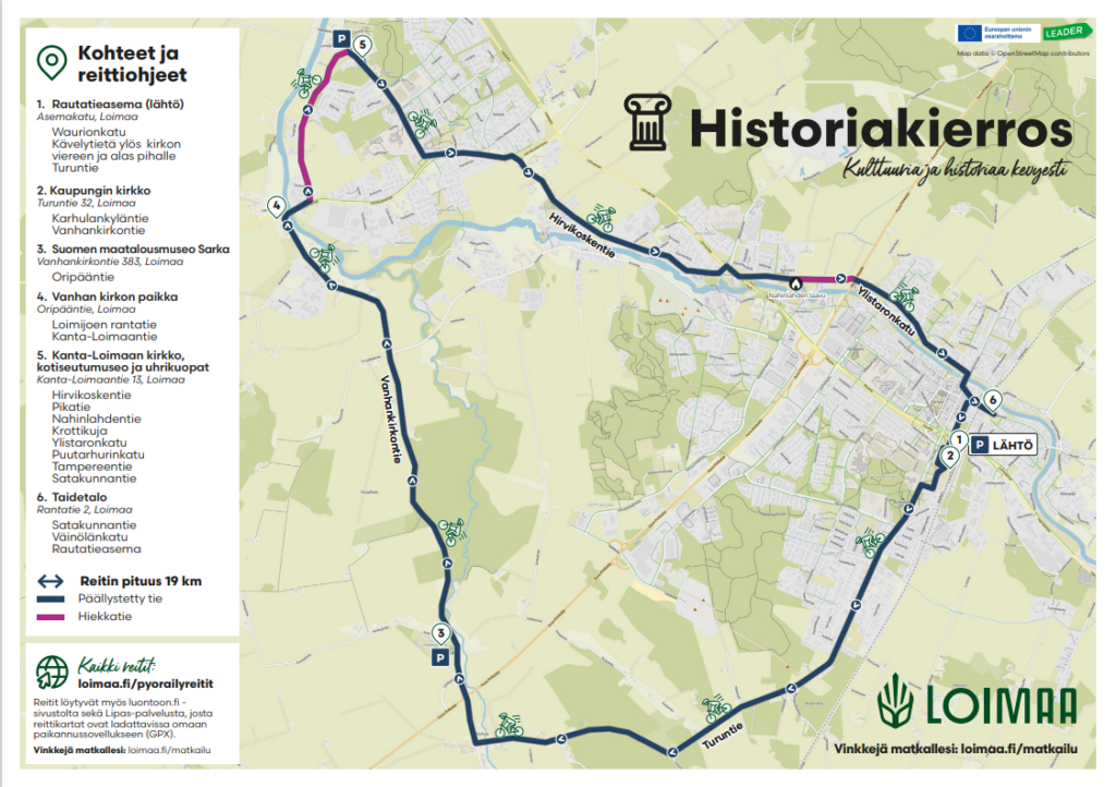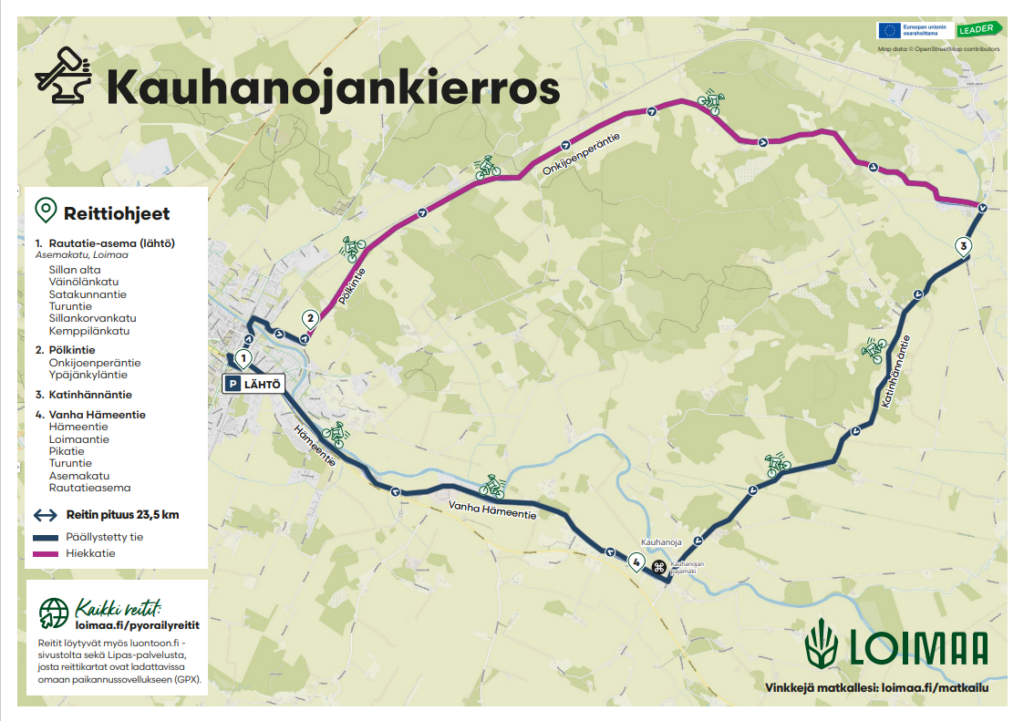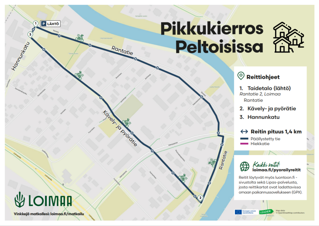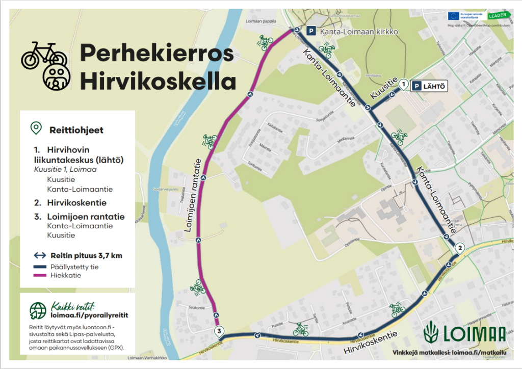 Jotta myös alueelle vieraampi pyöräilijä pääsisi helposti matkaan, Loimaan Älykkäät kylät -hankkeella on suunniteltu useita eritasoisia pyöräilyreittejä Loimaan alueelle. Reittien pituudet vaihtelevat lyhyestä 1,4 kilometrin lenkistä aina haastavampaan, jopa 108 kilometrin kierrokseen – jokaiselle löytyy jotakin kunnosta riippumatta.