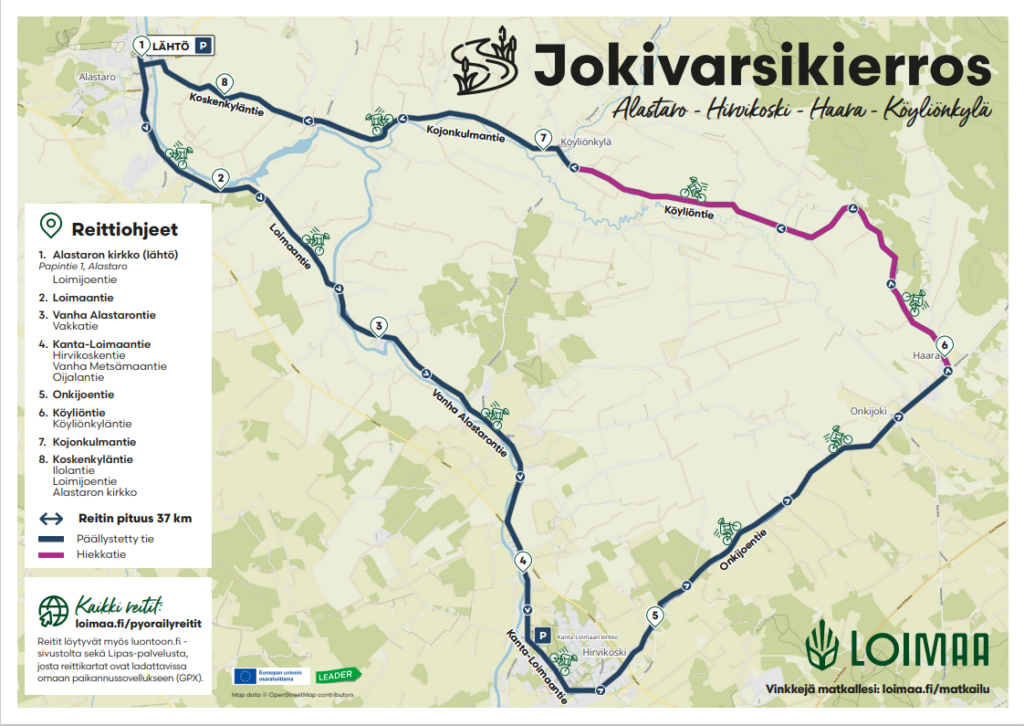 Reitti kulkee pitkään Loimijoen rantaa mukaillen Alastarolta Hirvikoskelle ja sieltä Haaran ja Köyliönkylän kautta Kojonjoen vartta takaisin Alastarolle. Reitin pituus 37 km. Reitistä n. 20 % on hiekkatietä.