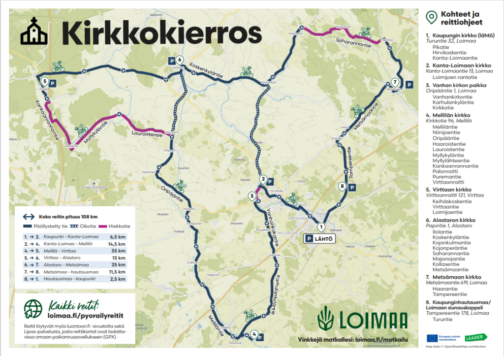 Reitti kulkee kaikkien Loimaan kuuden kirkon sekä Vanhan kirkon paikan että Kaupungin hautausmaan ja siunauskappelin ohitse. Reitin pituus on 108 km ja siitä on n. 20 % hiekkatietä.