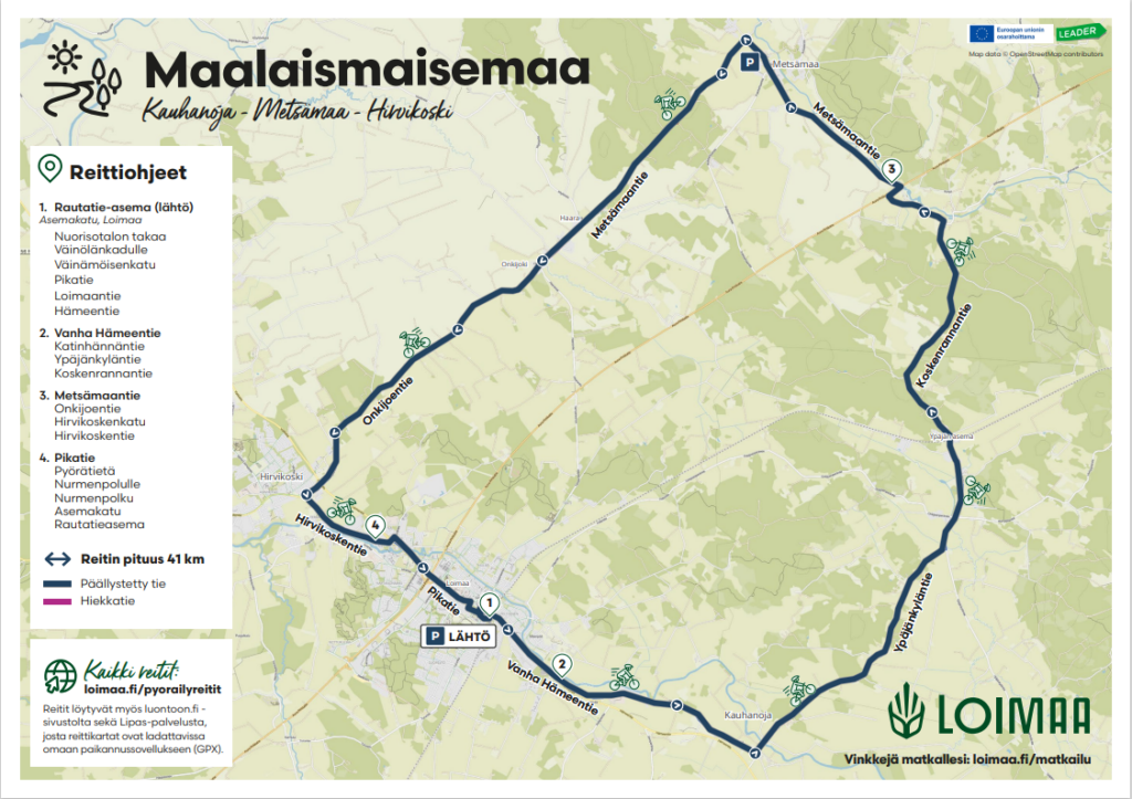 Reitti kulkee keskellä perinteistä loimaalaista maalaismaisemaa. Suuret tasaiset peltoaukeat vuorottelevat metsäosuuksien ja joenrantamaisemien kanssa matkalla rautatieasemalta Kauhanojan ja Metsämaan kautta Hirvikoskelle ja takaisin keskustaan. Reitin pituus on 41 km.