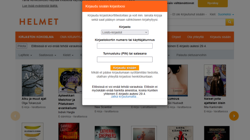 Huhtikuun lopulla auennut E-kirjasto tarjoaa e-kirjoja, äänikirjoja ja digilehtiä. Palvelun saa ladattua puhelimeen tai tablettiin sovelluskaupasta. Ensimmäisellä kerralla sovellukseen rekisteröidytään vahvalla tunnistautumisella.