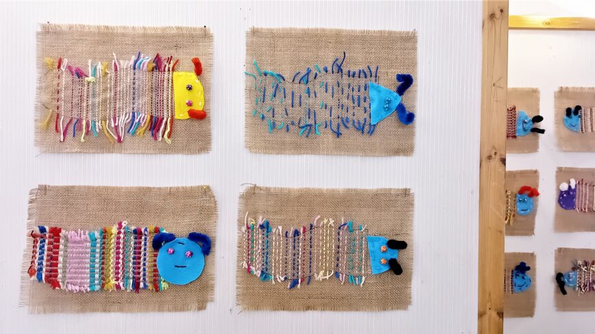 Hirvikosken ilttiksen eli tuttavallisemmin Hirvilttiksen 1. ja 2. luokan oppilaat ovat kevään ajan testanneet sorminäppäryyttään pujottelemalla lankaa säkkikankaaseen.