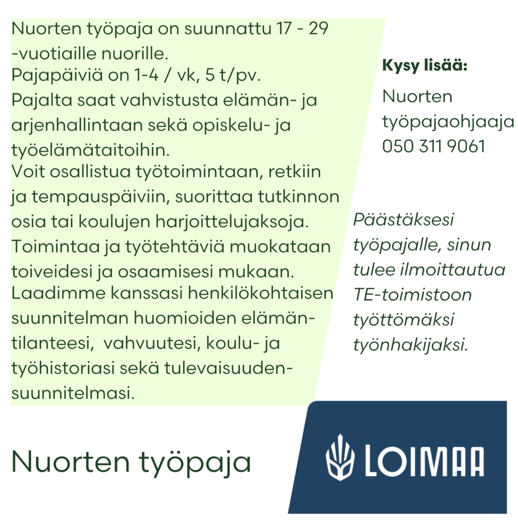 Nuorten työpaja on suunnattu 17 – 29 -vuotiaille loimaalaisnuorille. Nuori osallistuu pajatoimintaan 5 tuntia päivässä, 1 – 4 päivää viikossa.