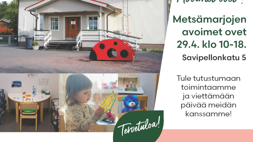 Avoimen varhaiskasvatuksen Metsämarjoissa avoimet ovet ti 29.4. klo 10-18. Savipellonkatu 5, 32200 Loimaa. Tule tutustumaan toimintaamme ja tiloihimme!