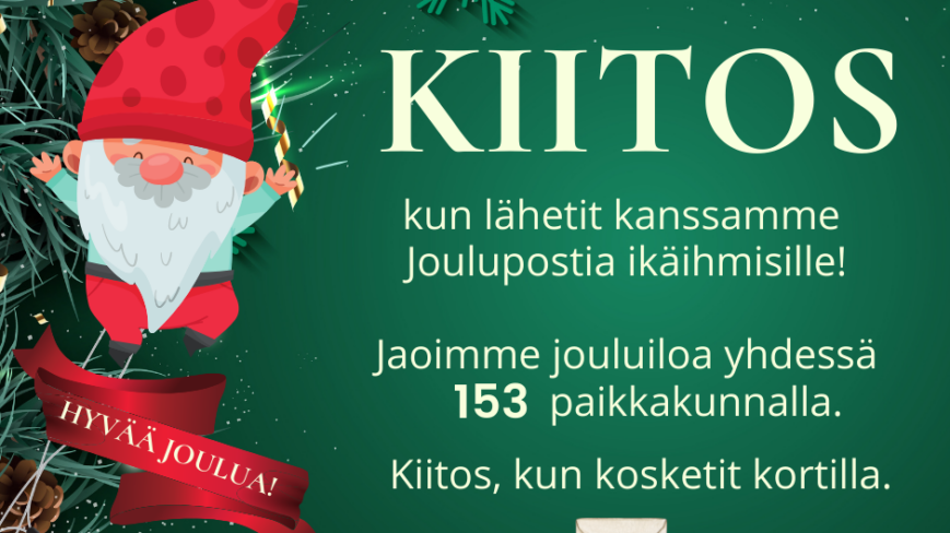 Loimaa oli ensimmäistä kertaa mukana Joulupostia ikäihmisille -kampanjassa, jossa kerättiin joulukortteja kotihoidon ja asumispalvelujen ikääntyneille asiakkaille.