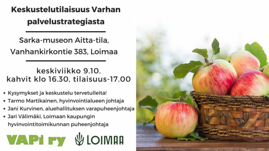 Loimaan kaupunki ja Varsinais-Suomen Vammais- ja Pitkäaikaissairausjärjestöt VAPI ry järjestävät ke 9.10. klo 17.00 kaikille avoimen keskustelutilaisuuden hyvinvointialueen palvelustrategiasta ja muista ajankohtaisista asioista.