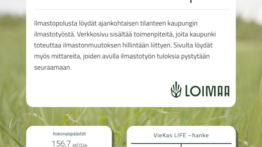Ilmastopolku löytyy osoitteesta loimaa.ilmastopolku.fi. Pääset ilmastotyösivustolle myös kaupungin verkkosivujen kautta seuraavaa reittiä: Asuminen ja Ympäristö -> Ympäristönsuojelu -> Ilmastopolku.