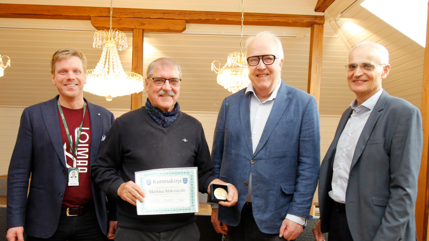 Mitalin luovutti kunniamerkki- ja arvonimitoimikunnan puheenjohtaja Olavi Ala-Nissilä. Kunniakirjan ojensivat kaupunginjohtaja Jari Rantala ja kehittämisjohtaja Paavo Laaksonen.