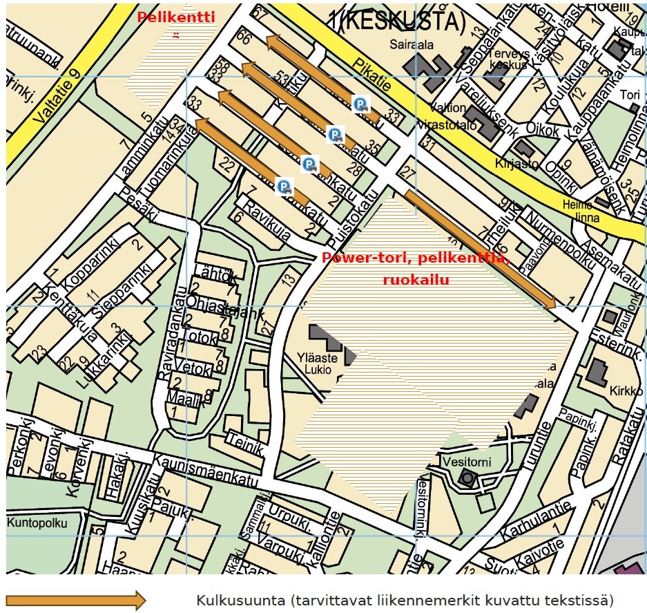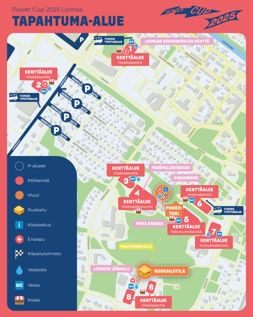 Loimaan lukion ja päiväkodin/jäähallin välinen hiekkakenttä ja lukion takapiha on varattu Power Cupin järjestäjän ja talkoolaisten pysäköintiin.