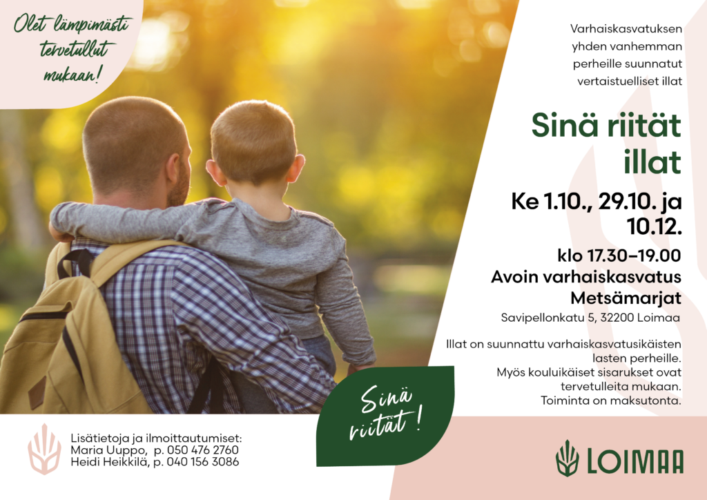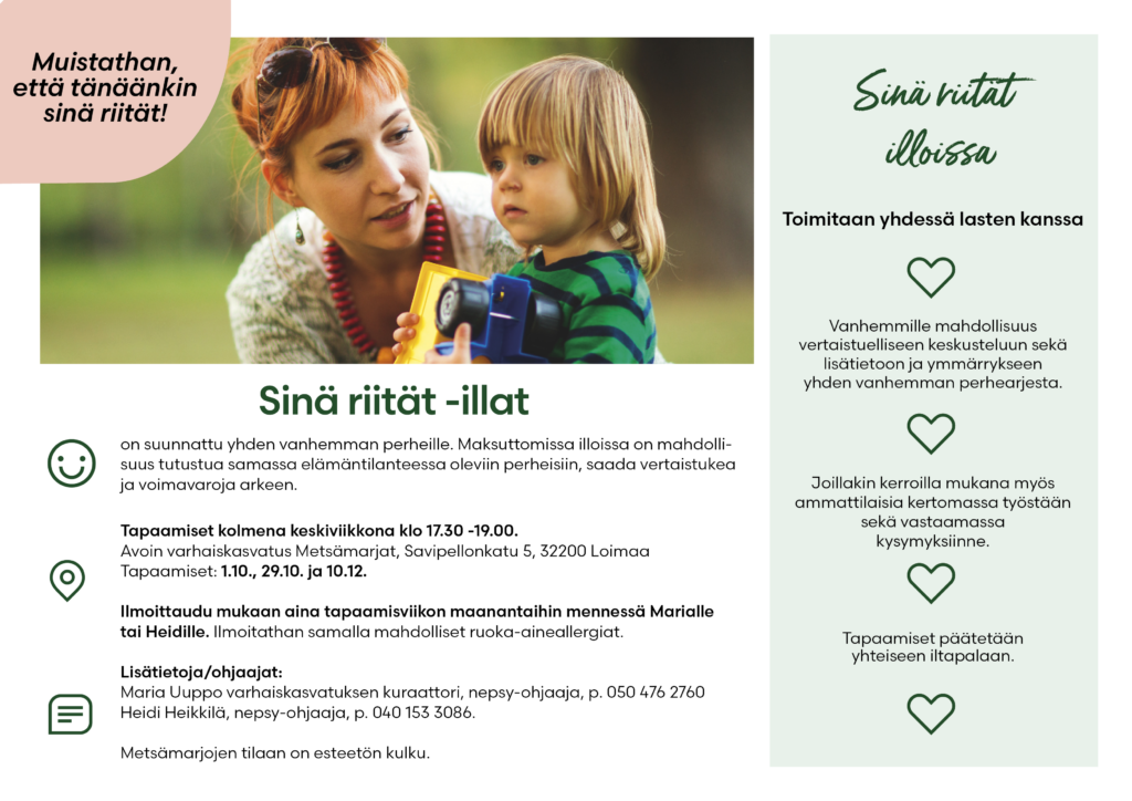 Varhaiskasvatuksen yhden vanhemman perheille suunnatut vertaistuelliset illat alkavat lokakuussa.
