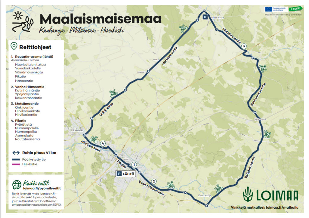 Reitti kulkee keskellä perinteistä loimaalaista maalaismaisemaa. Suuret tasaiset peltoaukeat vuorottelevat metsäosuuksien ja joenrantamaisemien kanssa matkalla rautatieasemalta Kauhanojan ja Metsämaan kautta Hirvikoskelle ja takaisin keskustaan. Reitin pituus on 41 km.