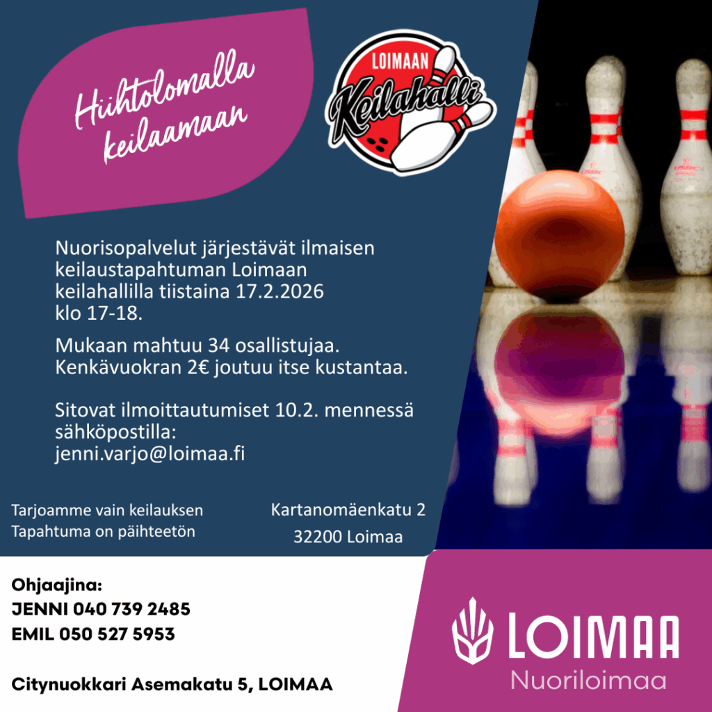 Nuorisopalvelut tarjoaa ilmaisen keilaustunnin Loimaan keilahallilla hiihtolomalla tiistaina 17.2. klo 17-18. Haasta kaverisi leikkimieliseen keilauskisaan ja tule keilaamaan ilmaiseksi. Kenkävuokra on 2€ jonka osallistuja itse maksaa.