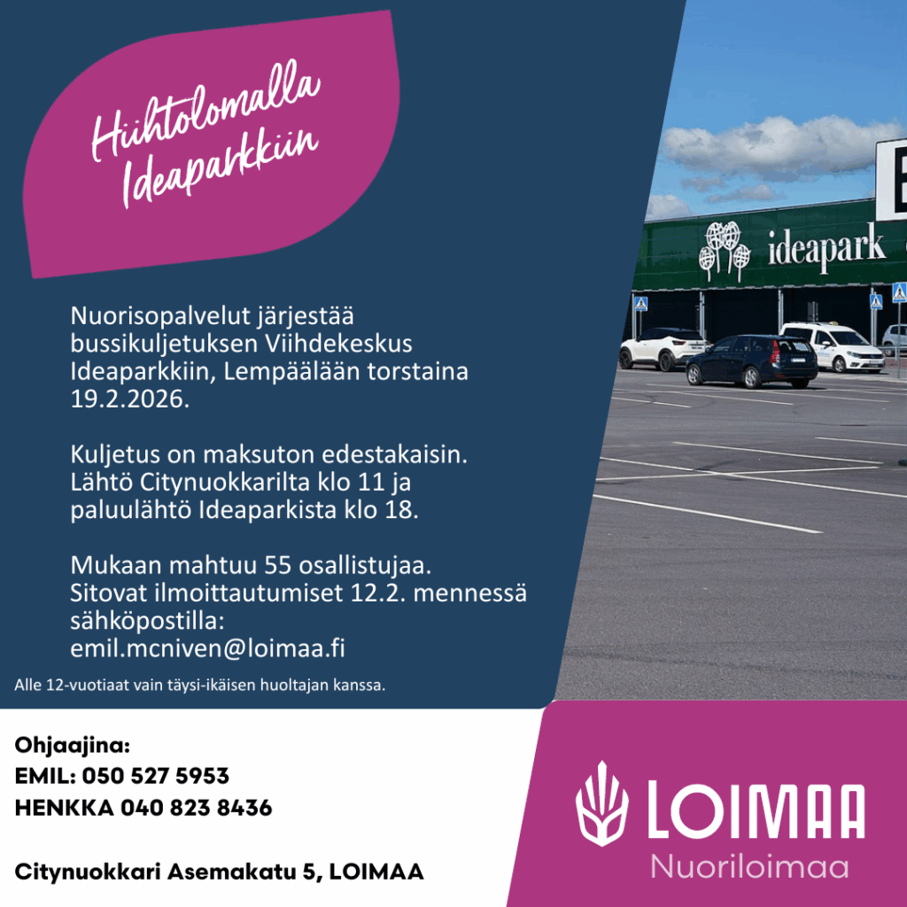 Nuorisopalvelut järjestää ilmaiskuljetuksen Viihdekeskus Ideaparkkiin torstaina 19.2. Viihdekeskus Ideaparkista löytyy koko perheelle kivaa ja hauskaa tekemistä. Nappaa kaverit mukaan ja lähde viettämään päivä Ideaparkissa.