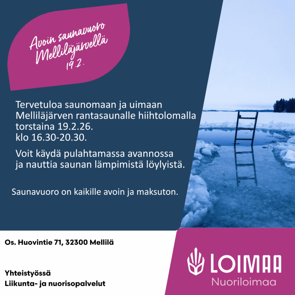 Hiihtolomalla on Melliläjärvellä avoin saunavuoro. Voit käydä pulahtamassa avannossa ja nauttia saunan lempeistä löylyistä.