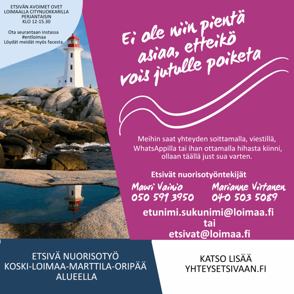 Etsivä nuorisotyöntekijä on rinnalla kulkija, joka auttaa selvittämään, miten ottaa seuraava askel. Mikään asia ei ole liian pieni tai liian suuri yhdessä ratkottavaksi! Jos tunnet olevasi yksin tai et tiedä keneltä jotain asiaa kysyisit, on etsivä nuorisotyöntekijä se henkilö, jonka puoleen kannattaa kääntyä. Etsiviin voi aina ottaa yhteyttä helposti, luottamuksellisesti ja ilmaiseksi.
