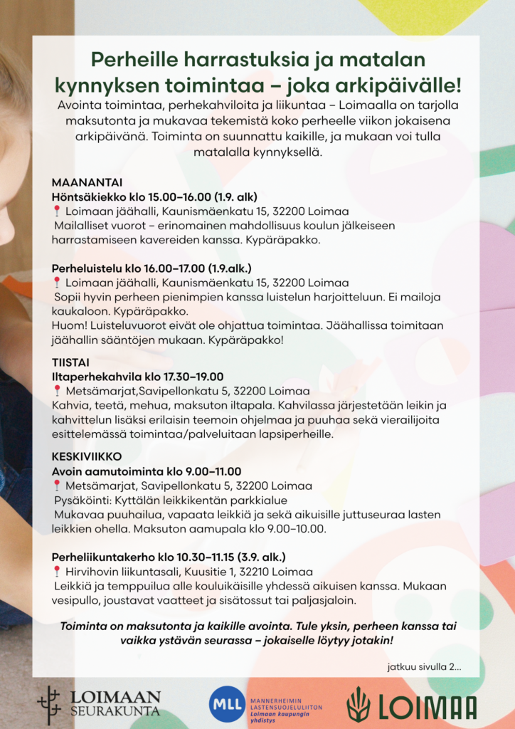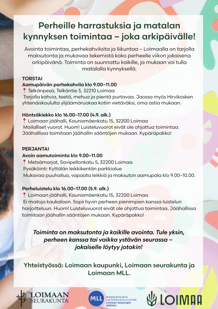 Avointa toimintaa, perhekahviloita ja liikuntaa – Loimaalla on tarjolla maksutonta ja mukavaa tekemistä koko perheelle viikon jokaisena arkipäivänä. Toiminta on suunnattu kaikille, ja mukaan voi tulla matalalla kynnyksellä. Tervetuloa mukaan toimintaan!