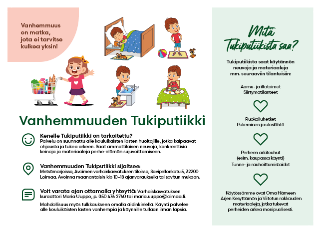 Kaipaatko tukea vanhemmuuteen tai lasten kasvatukseen? Vanhemmuuden Tukiputiikki tarjoaa matalan kynnyksen apua perhearjen haasteisiin. Voit tulla keskustelemaan eri teemoista yksin tai yhdessä toisen vanhemman kanssa.
